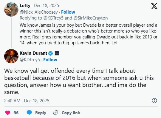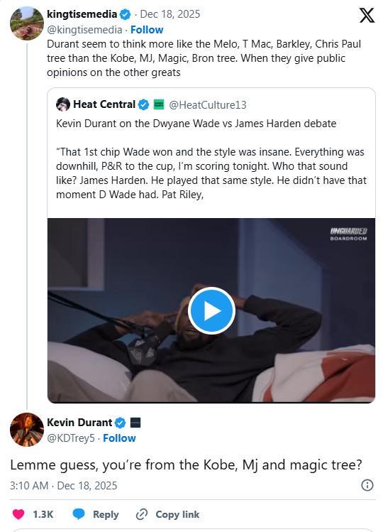 一位網(wǎng)友轉(zhuǎn)發(fā)了杜蘭特點(diǎn)評哈登和韋德的訪談片段,并聲稱杜蘭特與喬丹、科比、魔術(shù)師約翰遜和詹姆斯等傳奇球星沒有相同的思維方式,杜蘭特對此進(jìn)行了嘲諷式的回應(yīng):“讓我猜猜,你是來自科比、邁克爾-喬丹和魔術(shù)師約翰遜那個(gè)時(shí)代的人吧?”