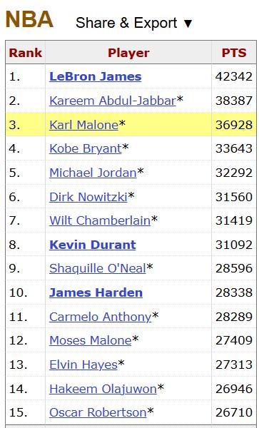 截至目前,詹姆斯以42342分高居歷史總得分榜第一位。