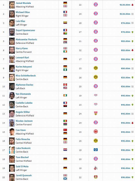 在本次身價更新中,穆西亞拉身價下跌1000萬歐至1.3億歐,與奧利塞并列第一,于帕梅卡諾身價上漲1000萬歐至7000萬歐與迪亞斯并列第三,凱恩身價下跌1000萬至6500萬歐,與帕夫洛維奇并列第五,卡爾身價上漲4000萬歐至6000萬歐。
