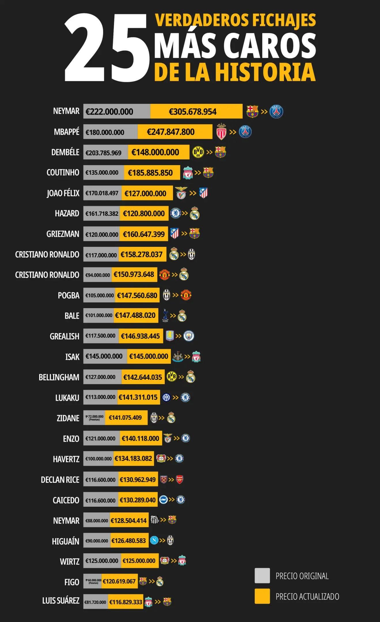 Betfair重新計(jì)算世界足壇歷史最貴的25筆交易: